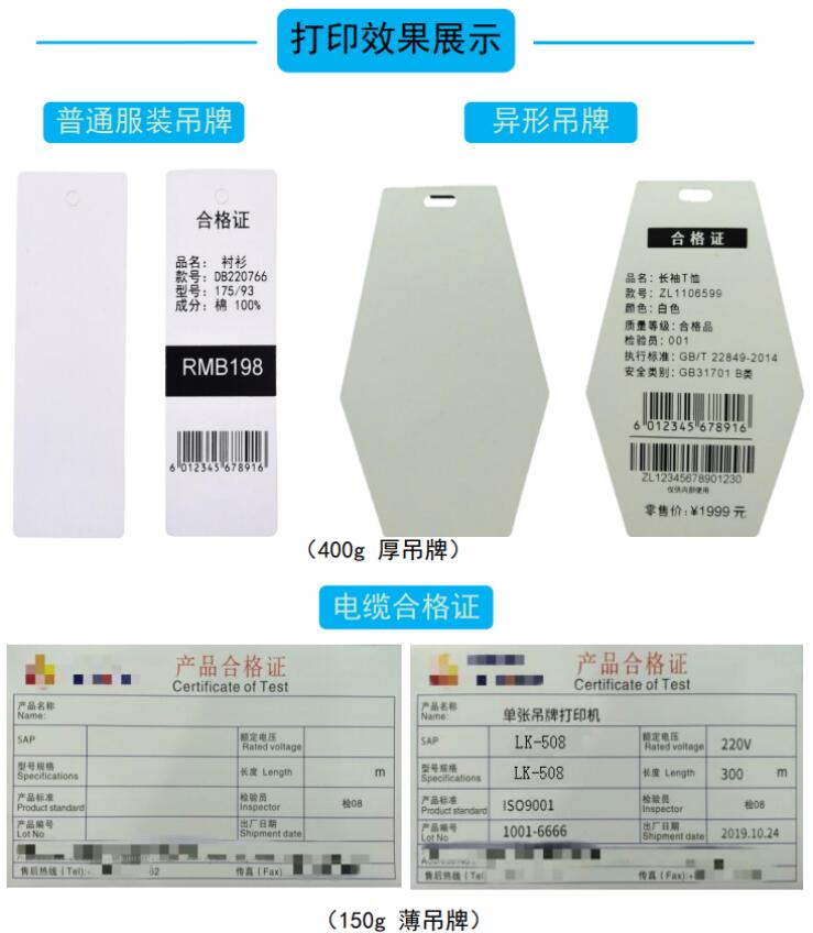 單張服裝吊牌打印機(jī)是專業(yè)用于一張張打印單張服裝吊牌,或單張產(chǎn)品合格證吊牌的打印機(jī)。它廣泛使用于服裝吊牌、鞋帽產(chǎn)品合格證吊牌。